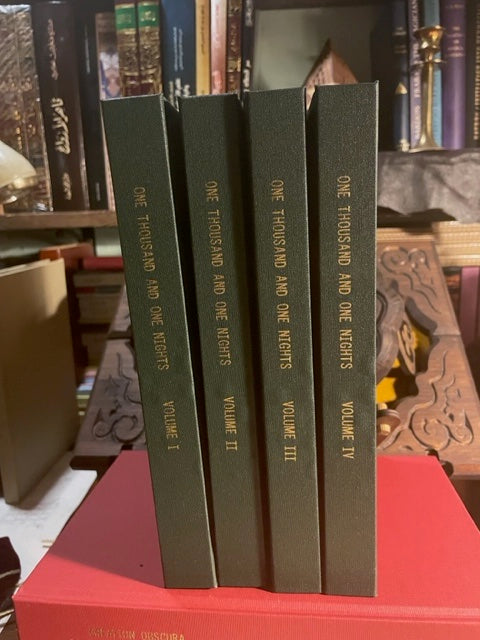 Green Linen wrap Hardcover with gold spine embossing, colored and fully illustrated 4 volume set over 1200 pages rare Arabic manuscript: One Thousand and One Nights. الف ليلة وليلة