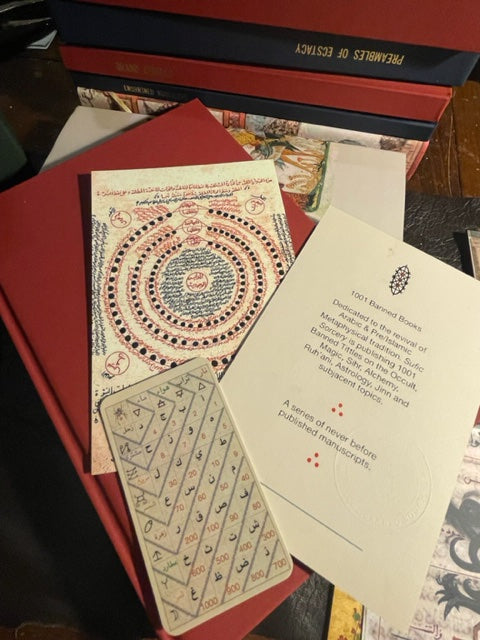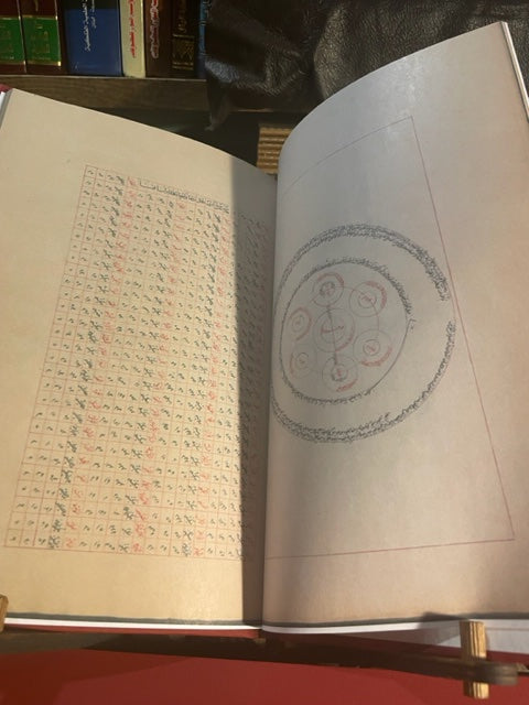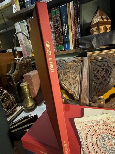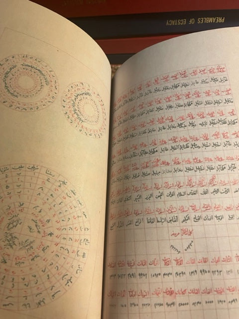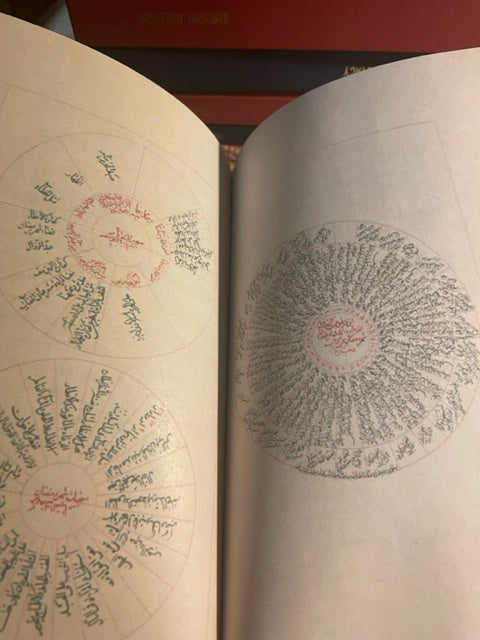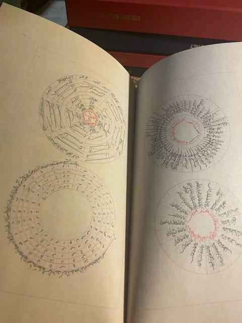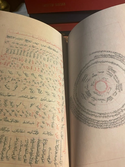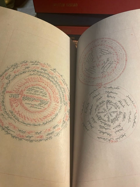 Red Linen wrap Hardcover with gold spine embossing, colored and fully illustrated 103 pages rare Arabic manuscript: دوائر العلوم و جداول الرسوم circles and Tables