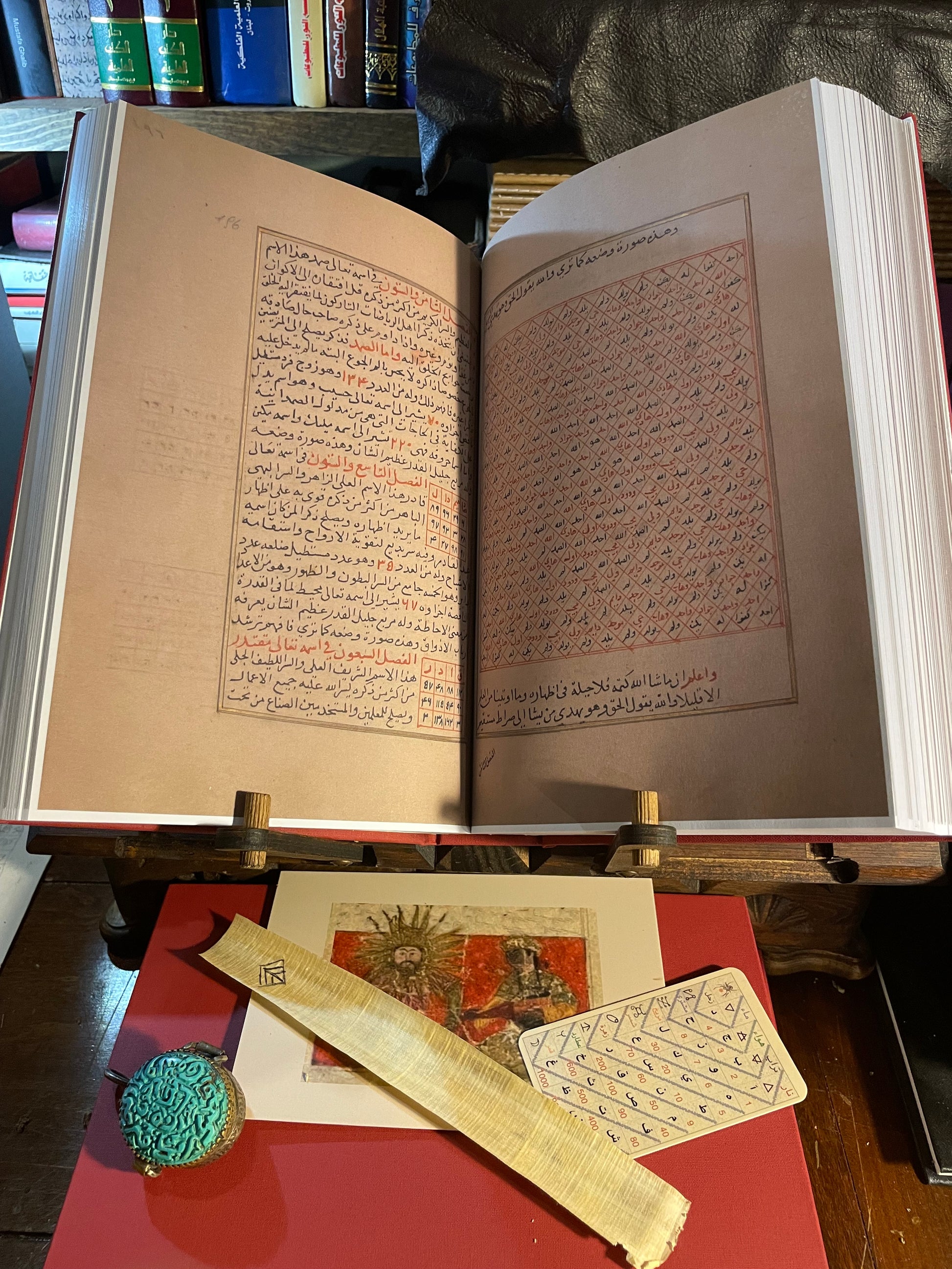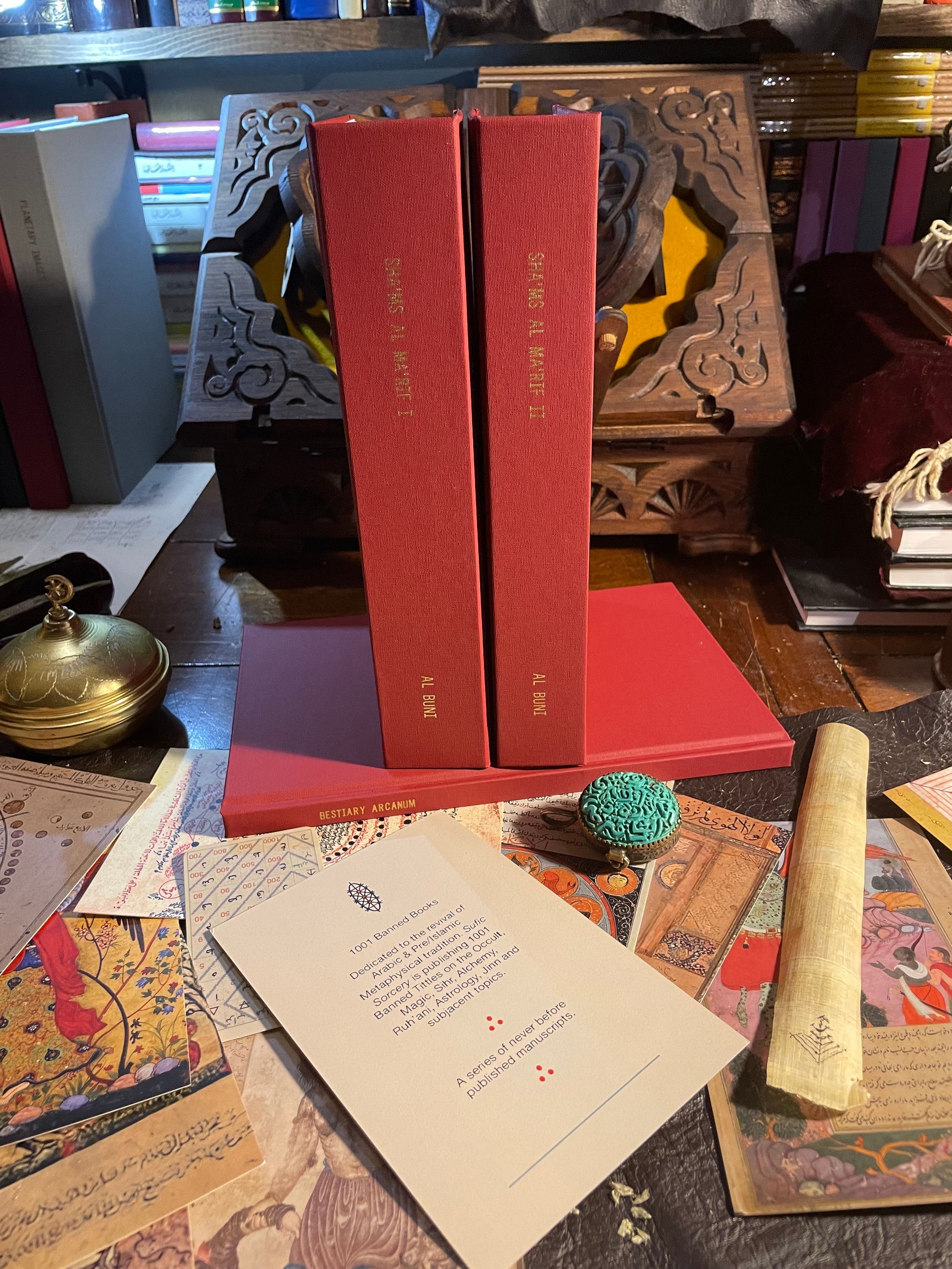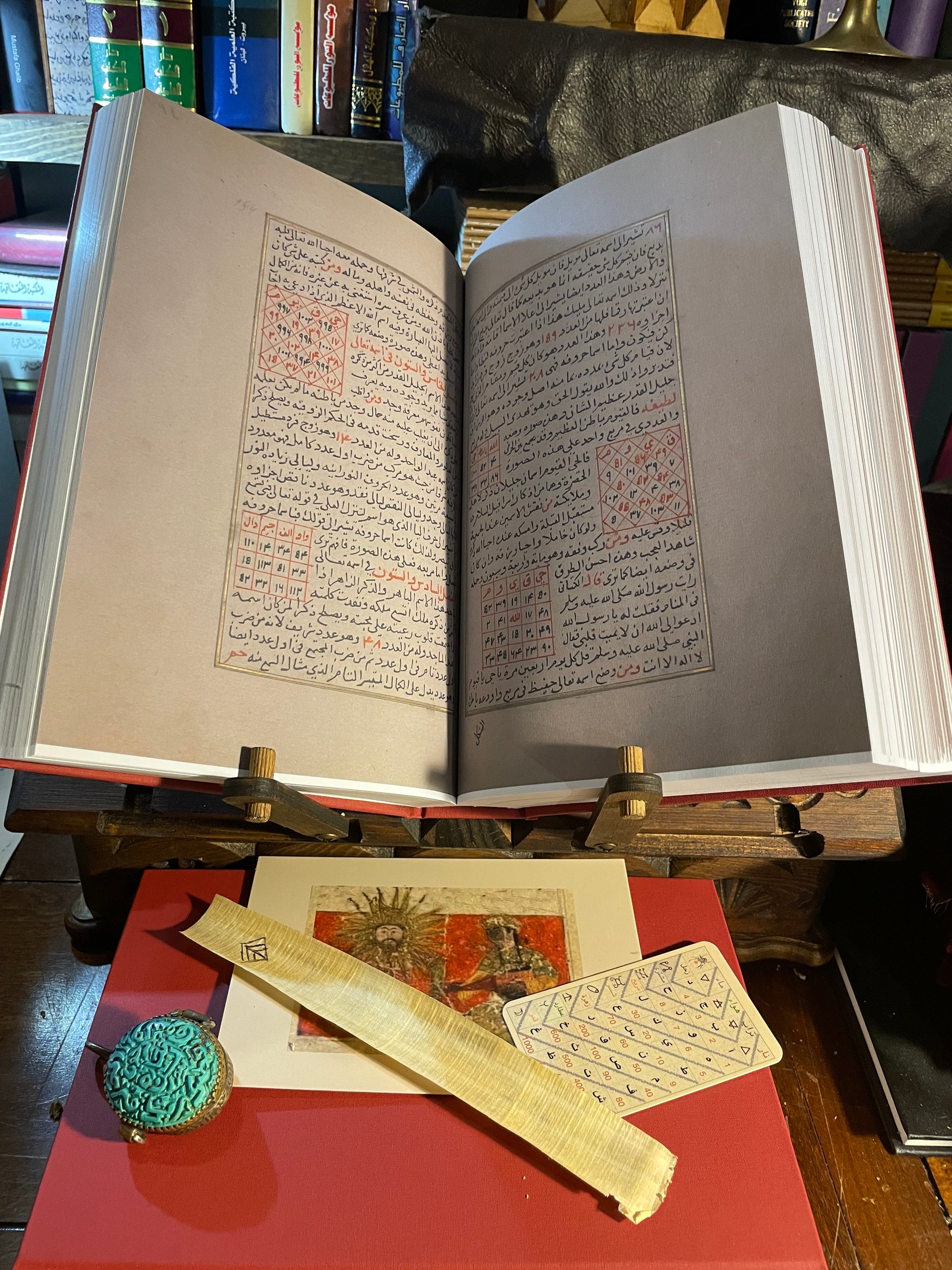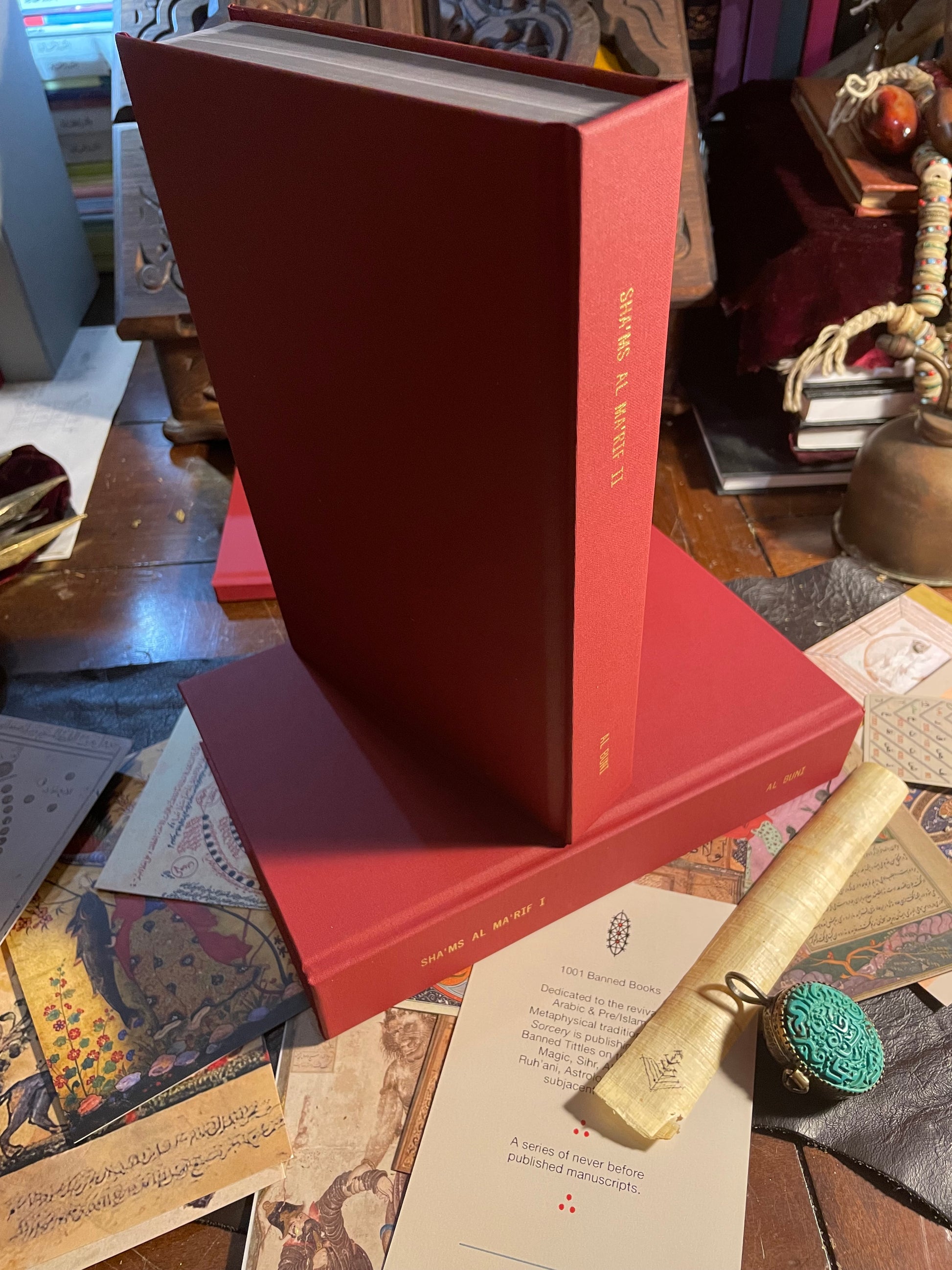 Red linen Wrap Hardcover, over 1100 pages in two volumes fully colored and illustrated facsimile reproduction of the Original Arabic Manuscript 'Grand Sun of Gnosis' شمس المعارف الكبرى.