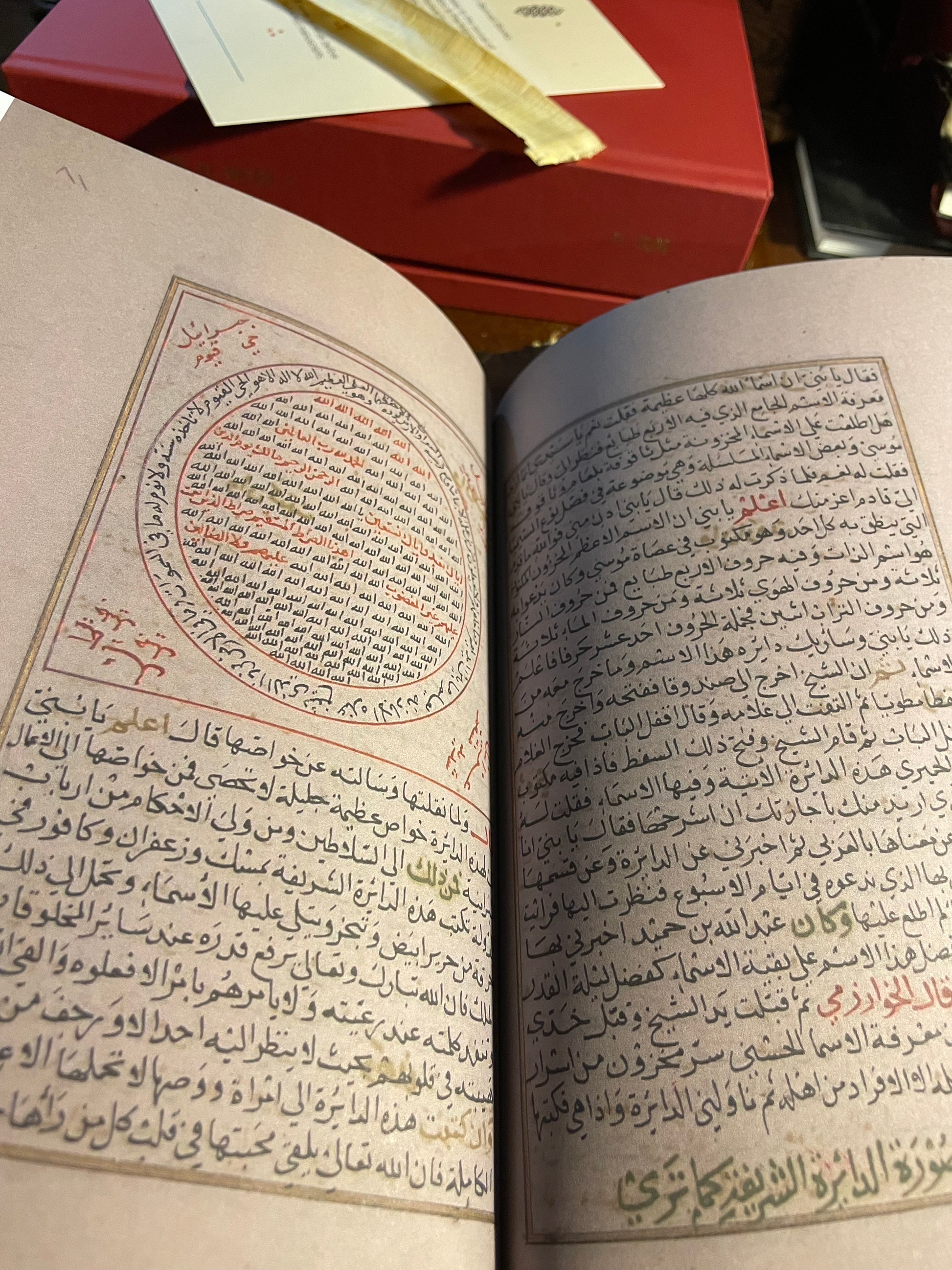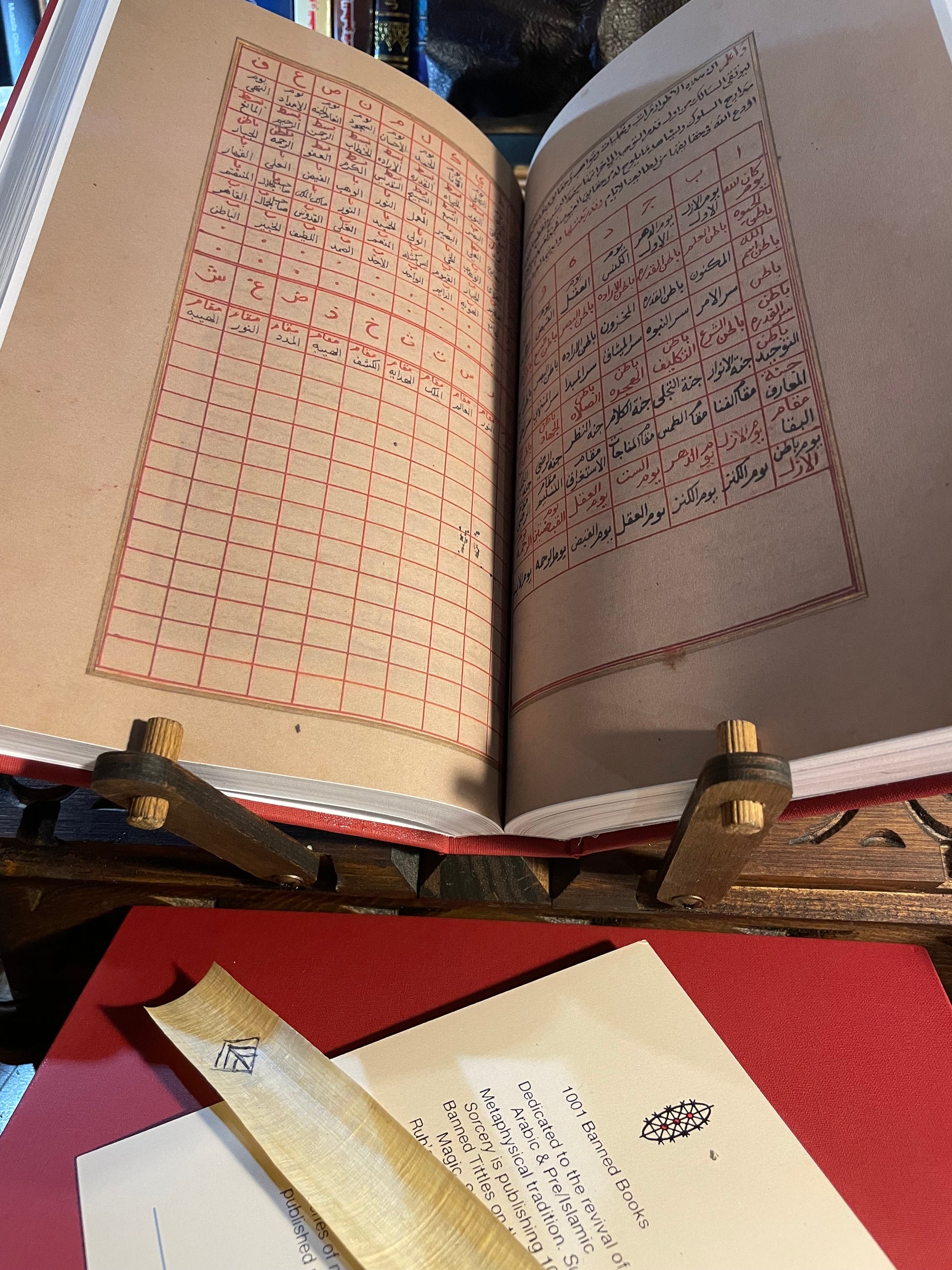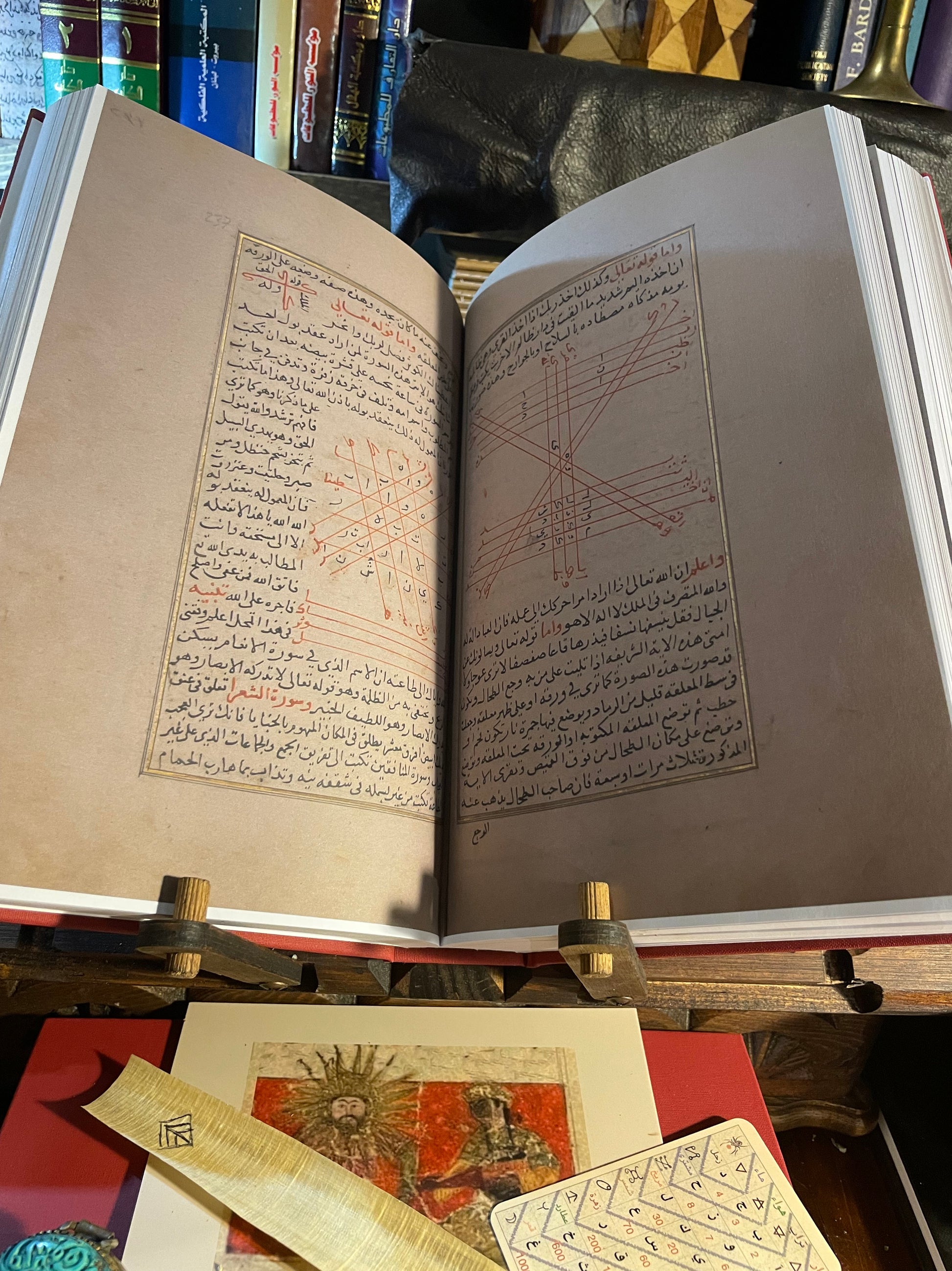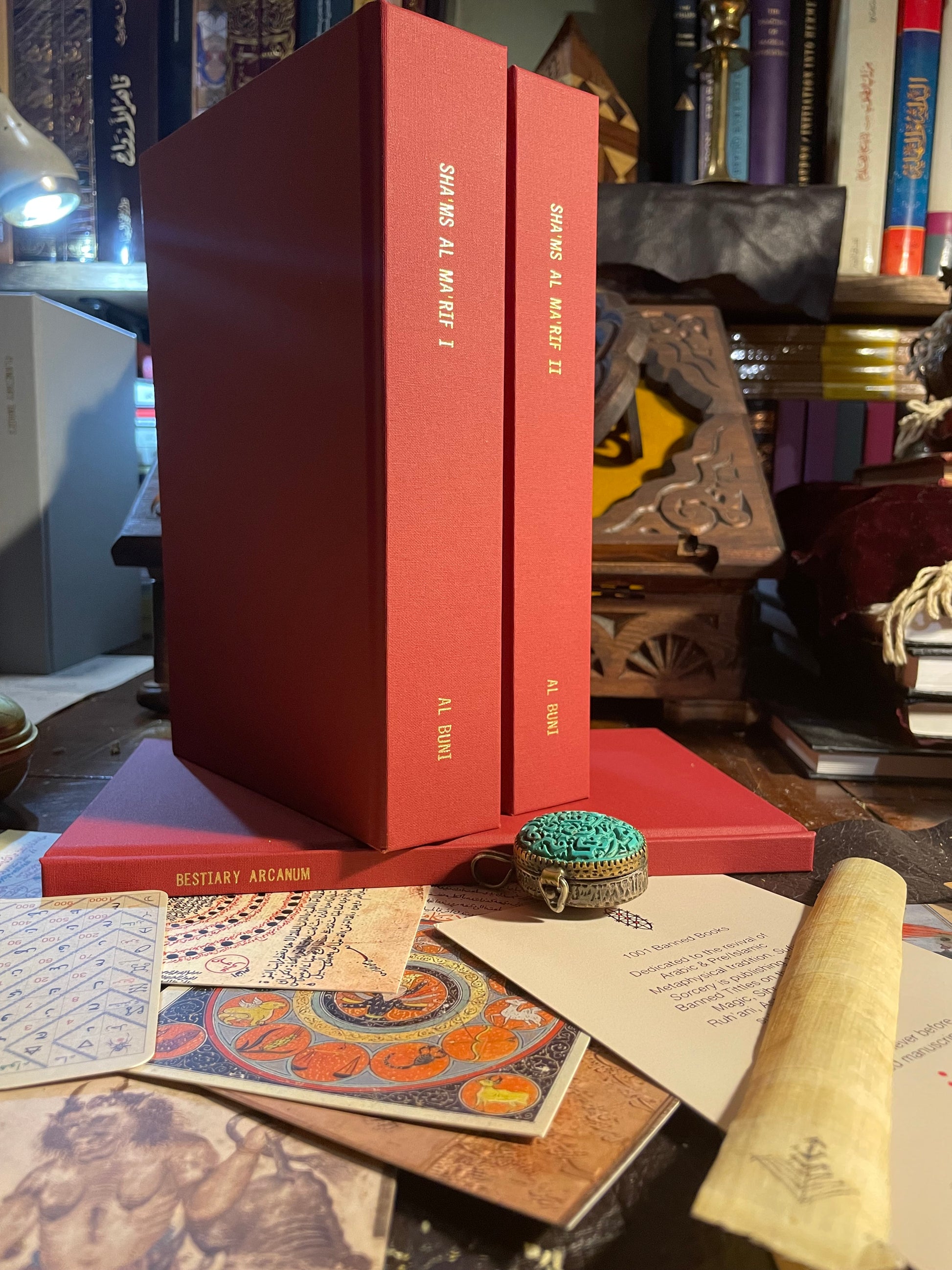 Red linen Wrap Hardcover, over 1100 pages in two volumes fully colored and illustrated facsimile reproduction of the Original Arabic Manuscript 'Grand Sun of Gnosis' شمس المعارف الكبرى.