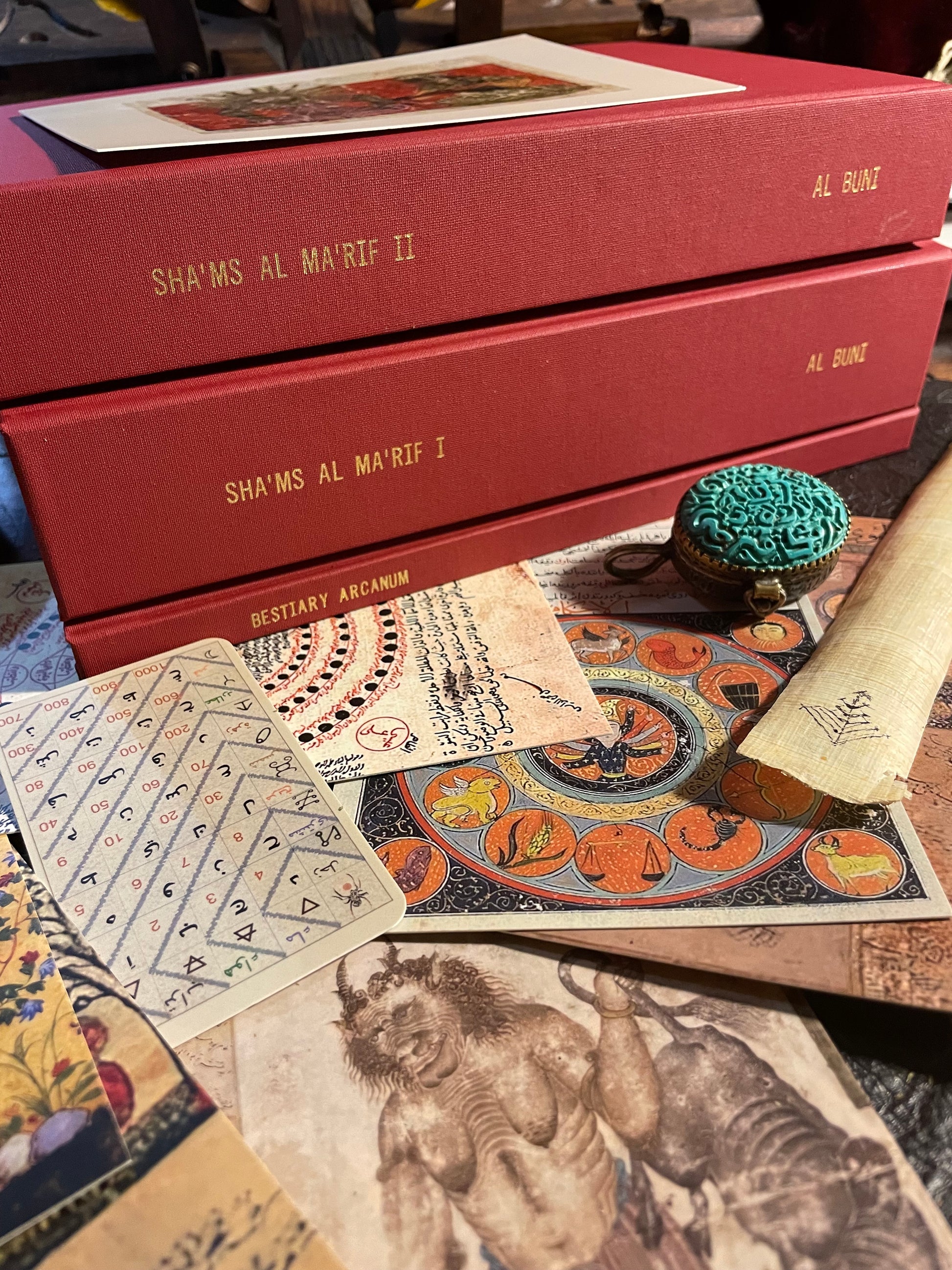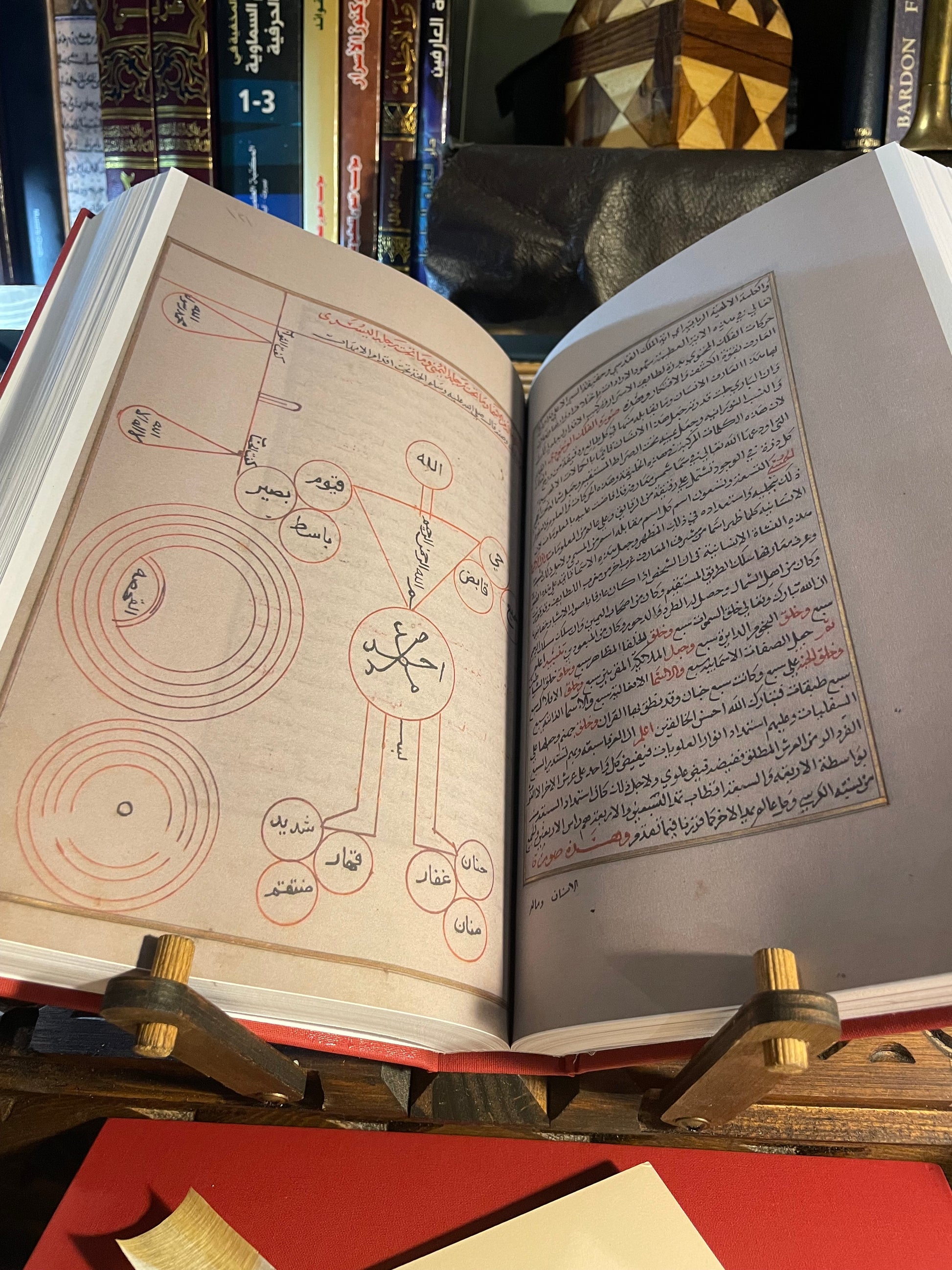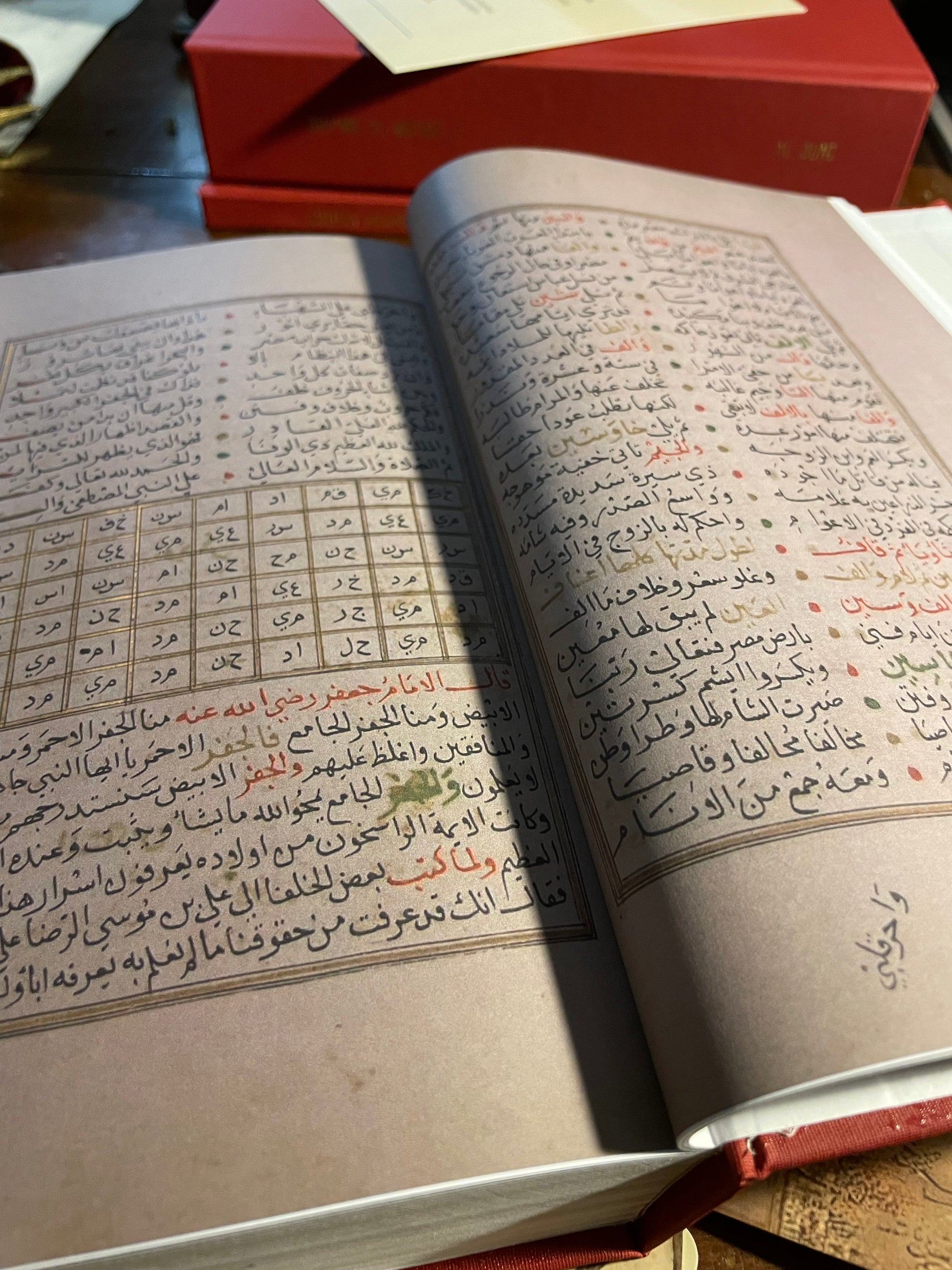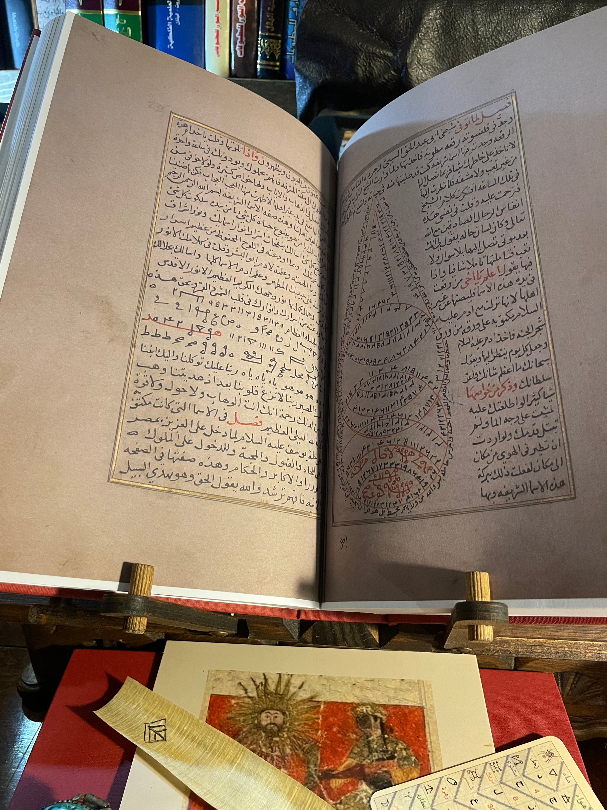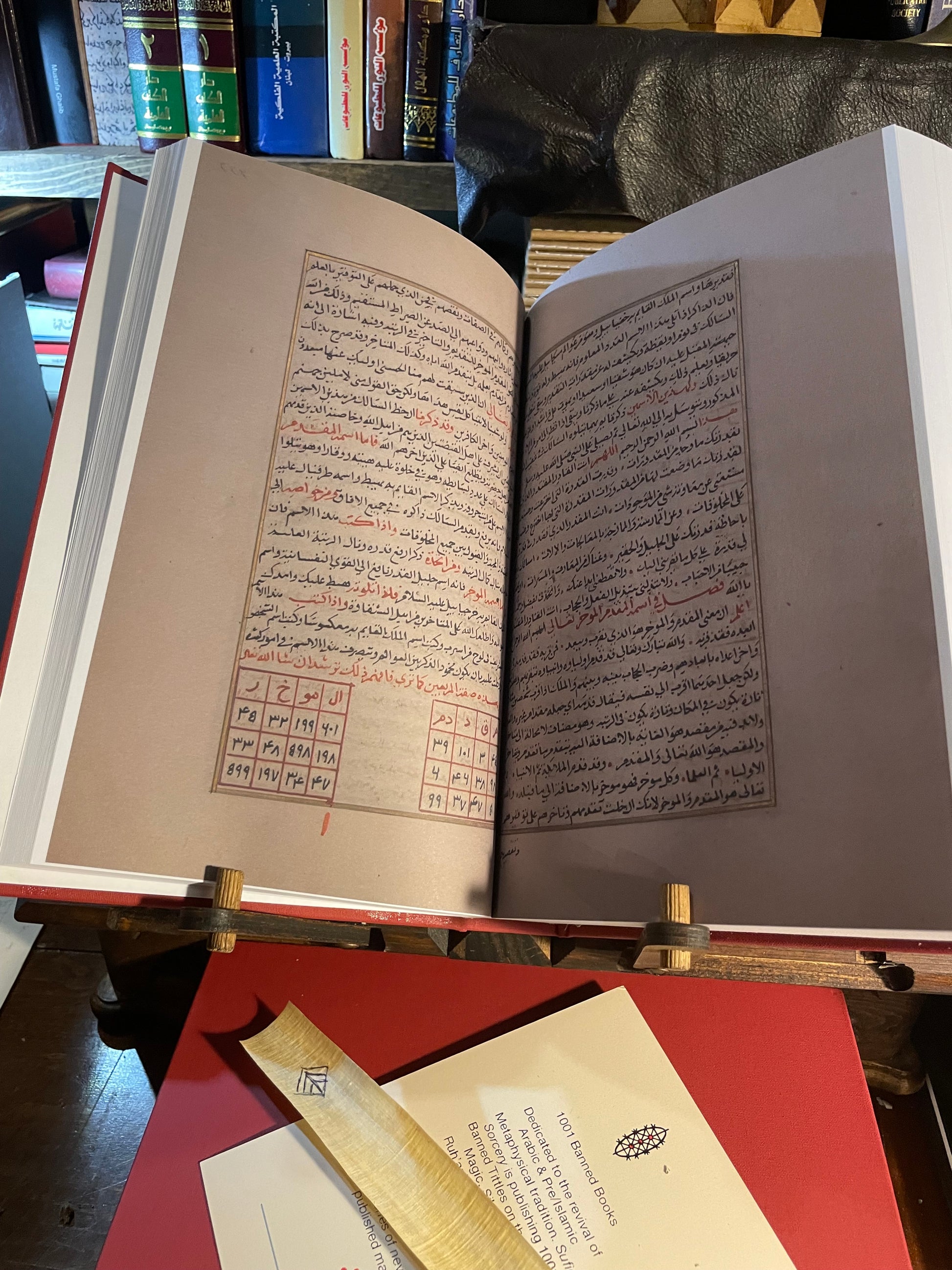 Red linen Wrap Hardcover, over 1100 pages in two volumes fully colored and illustrated facsimile reproduction of the Original Arabic Manuscript 'Grand Sun of Gnosis' شمس المعارف الكبرى.