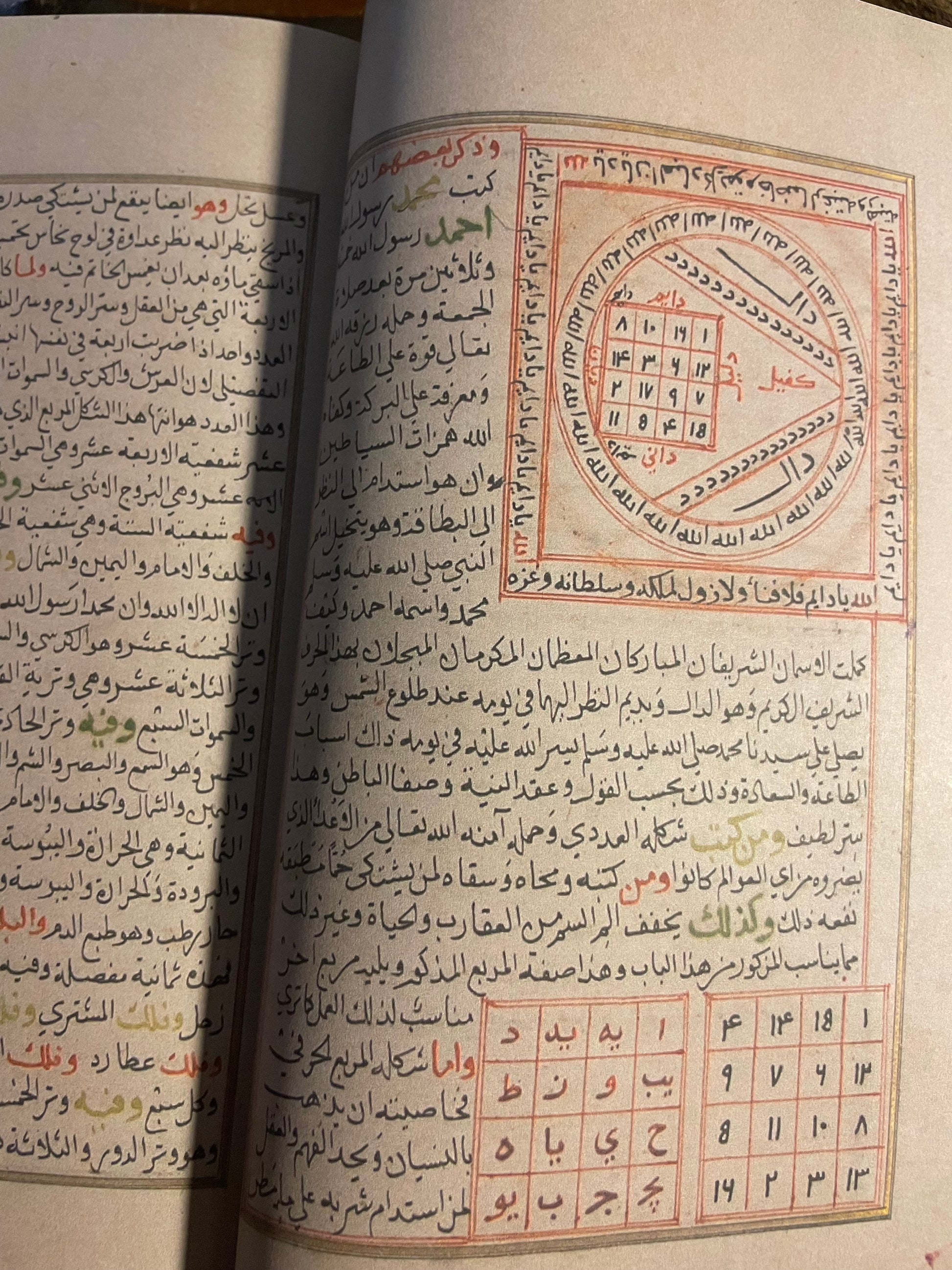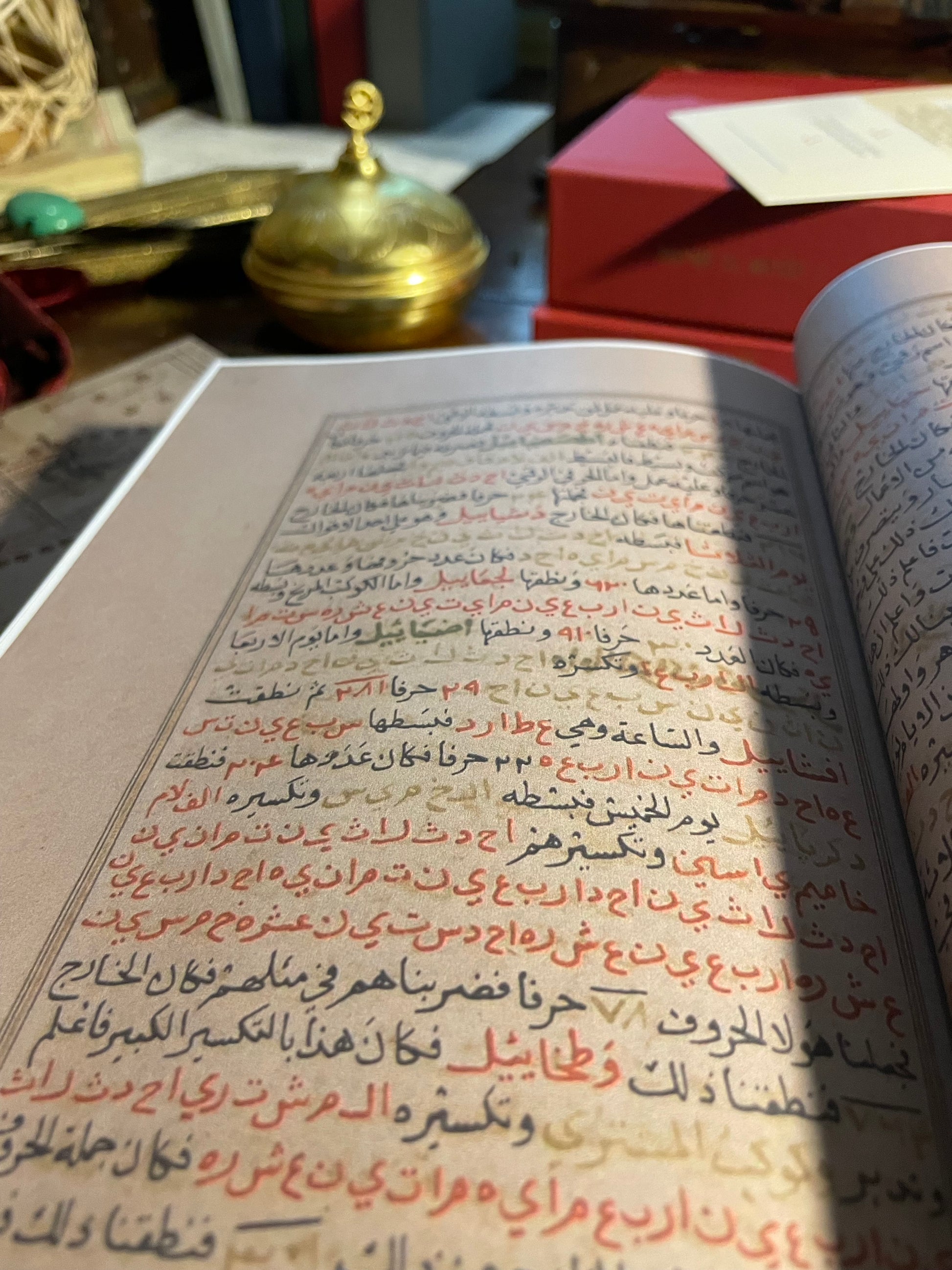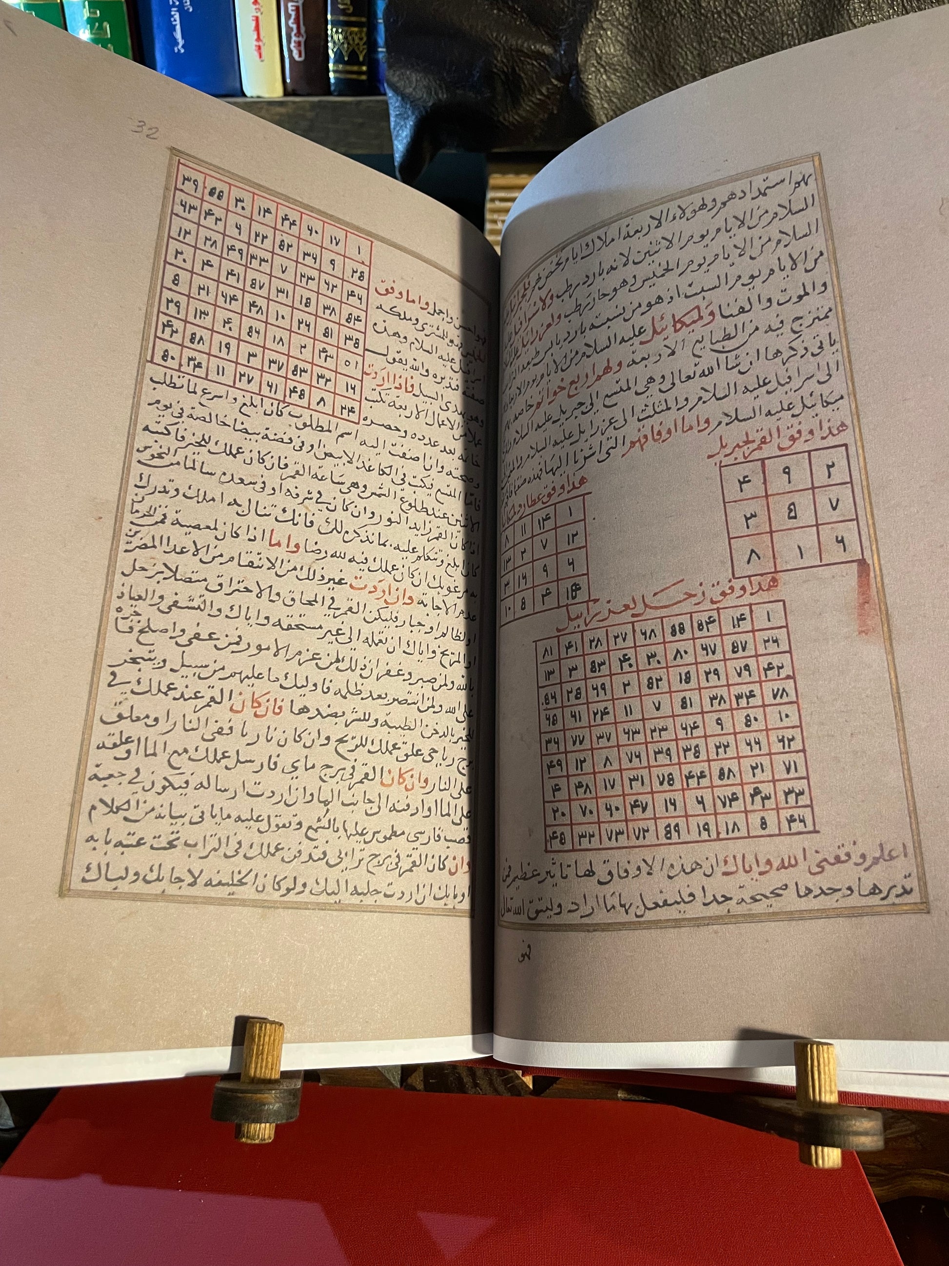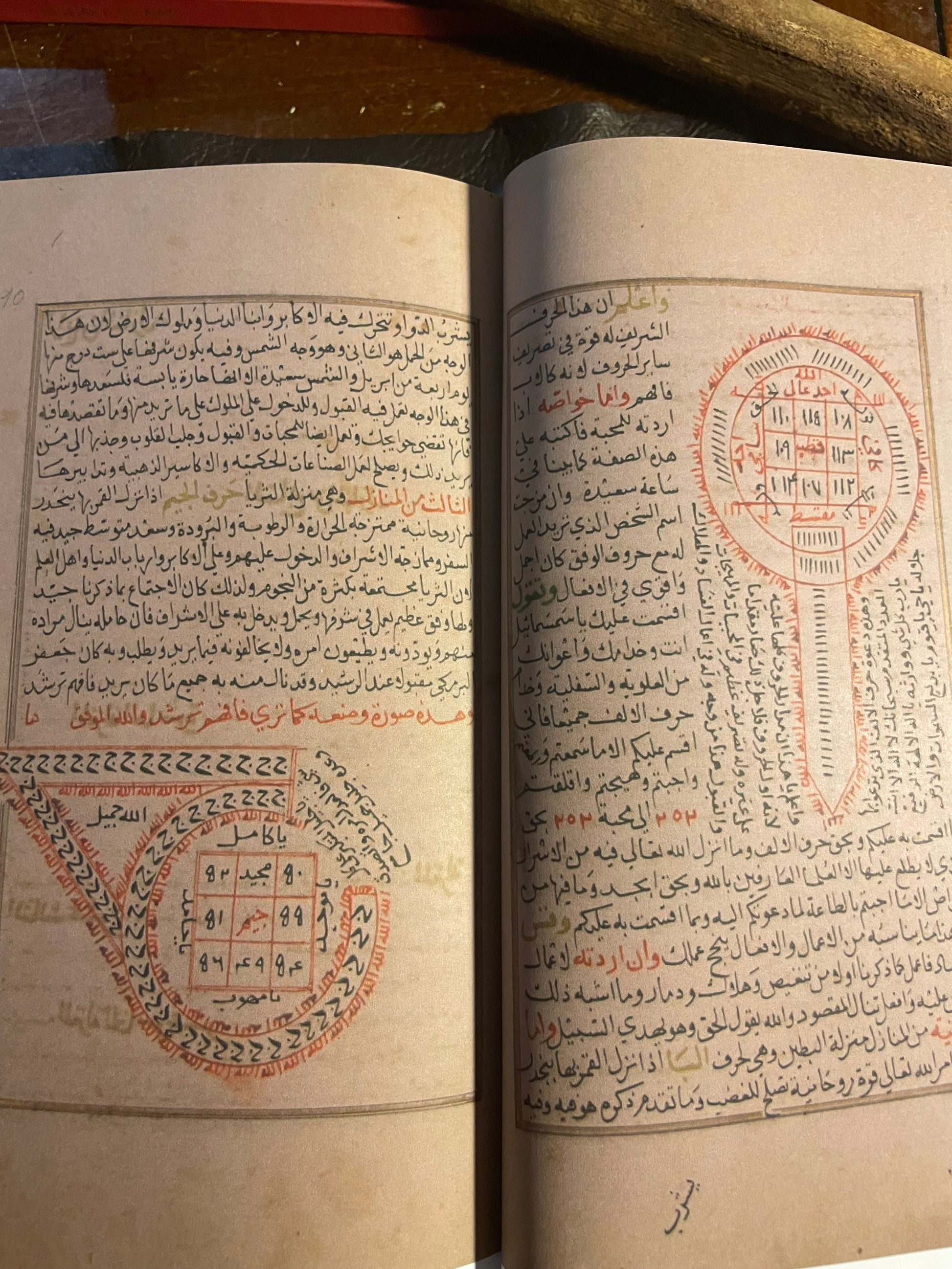 Red linen Wrap Hardcover, over 1100 pages in two volumes fully colored and illustrated facsimile reproduction of the Original Arabic Manuscript 'Grand Sun of Gnosis' شمس المعارف الكبرى.