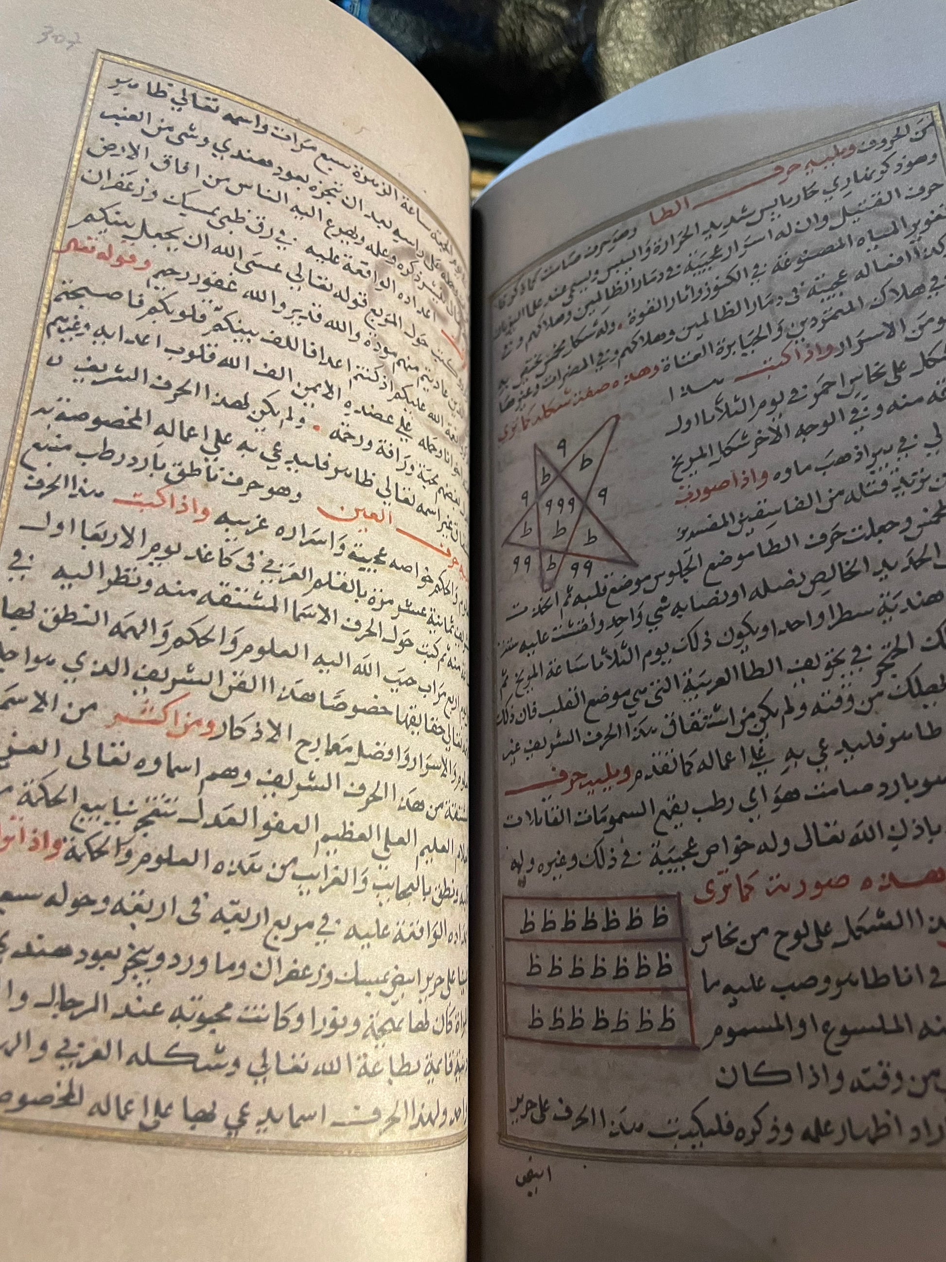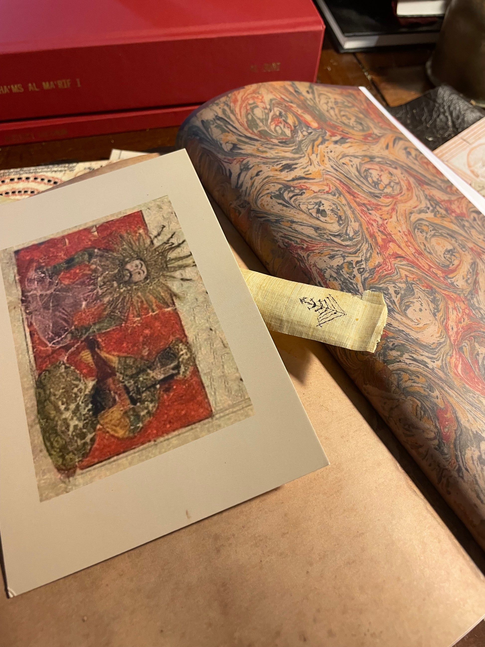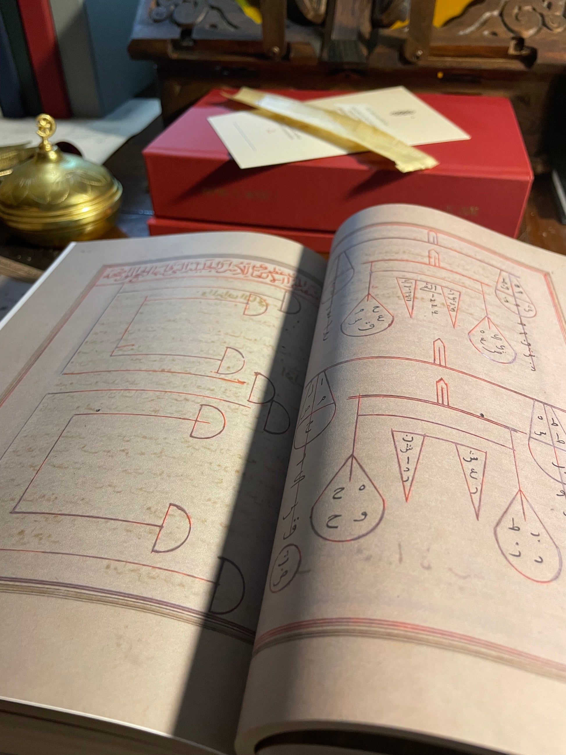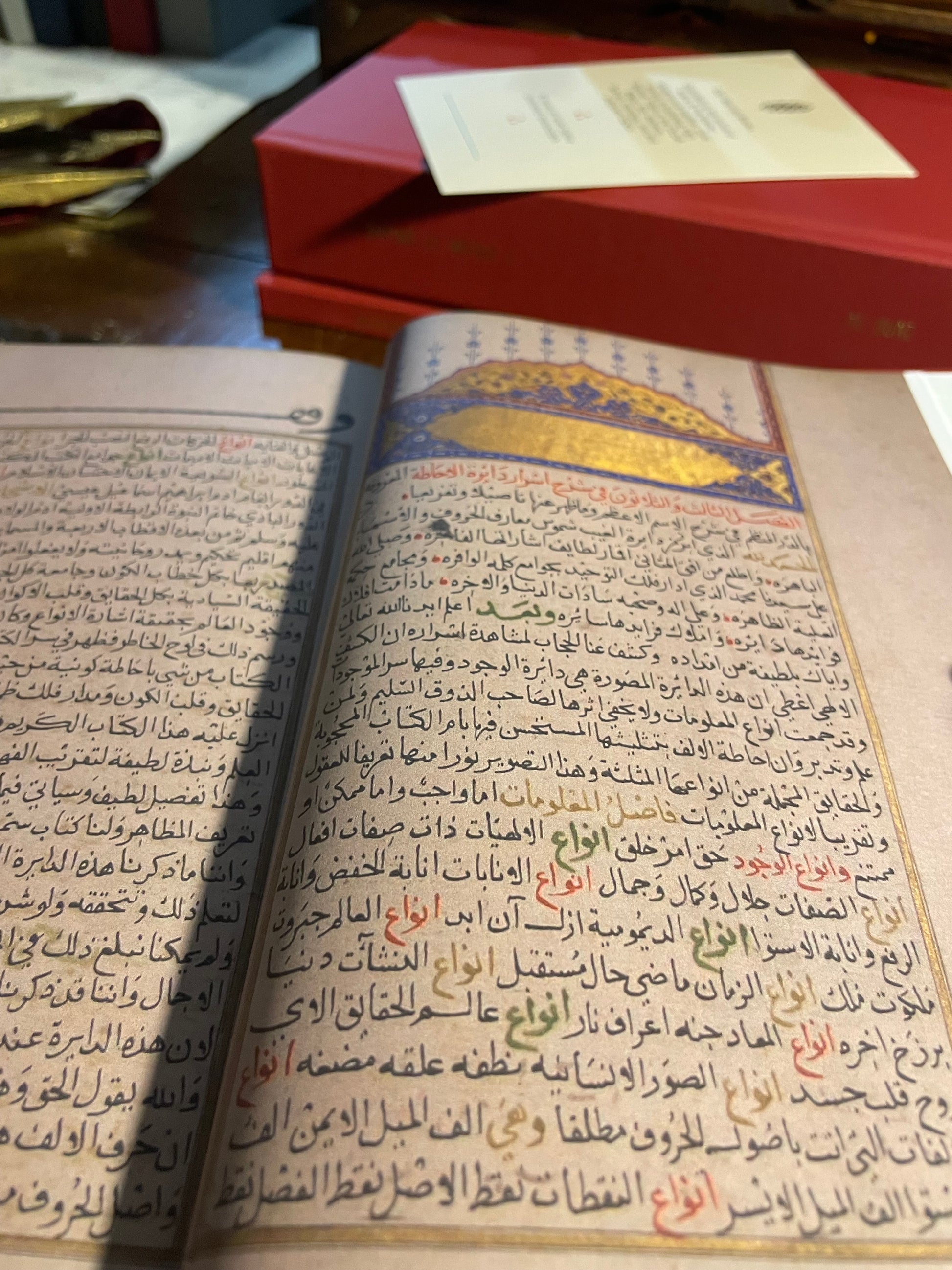 Red linen Wrap Hardcover, over 1100 pages in two volumes fully colored and illustrated facsimile reproduction of the Original Arabic Manuscript 'Grand Sun of Gnosis' شمس المعارف الكبرى.